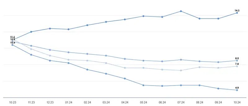 В Казахстане инфляция за последний год составила 8,5%, с небольшим снижением до 8,3% в сентябре 2024 года. Значительный вклад в этот показатель внесли тарифы на платные услуги, которые увеличились на 14,3% за год (в сентябре – на 13,6%). В то же время цены на непродовольственные товары возросли на 7,8%, а на продовольственные – на 4,9%.