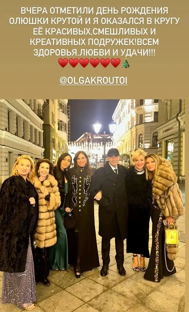 26 ноября композитор Игорь Крутой поделился в Instagram-Stories снимком с 61-летней именинницей Ольгой Крутой и ее подругами, среди которых была и известная певица Алсу. В своем посте Игорь отметил, что ему повезло оказаться в компании красивых и креативных женщин. Он пожелал всем здоровья, любви и удачи.