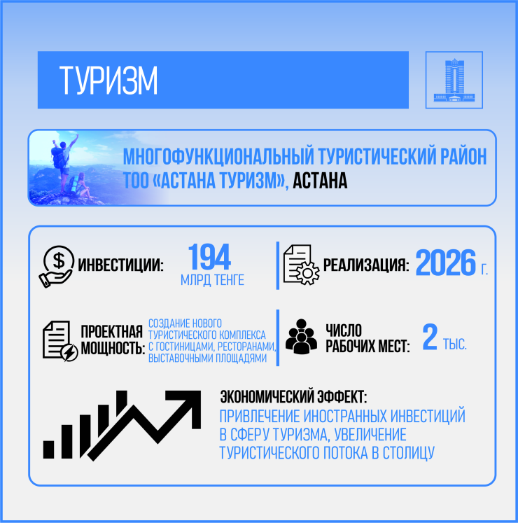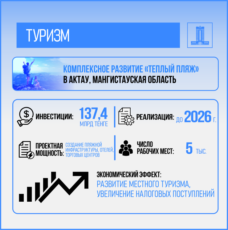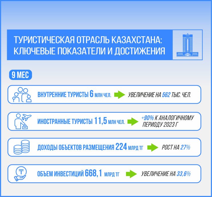 Туризм также стал важным двигателем экономического роста. В 2024 году количество внутренних туристов увеличилось на 562 тысячи, а число иностранных посетителей возросло почти в два раза. Инвестиции в туристическую отрасль достигли 668,1 миллиарда тенге, что свидетельствует о растущем интересе к стране как к туристическому направлению.