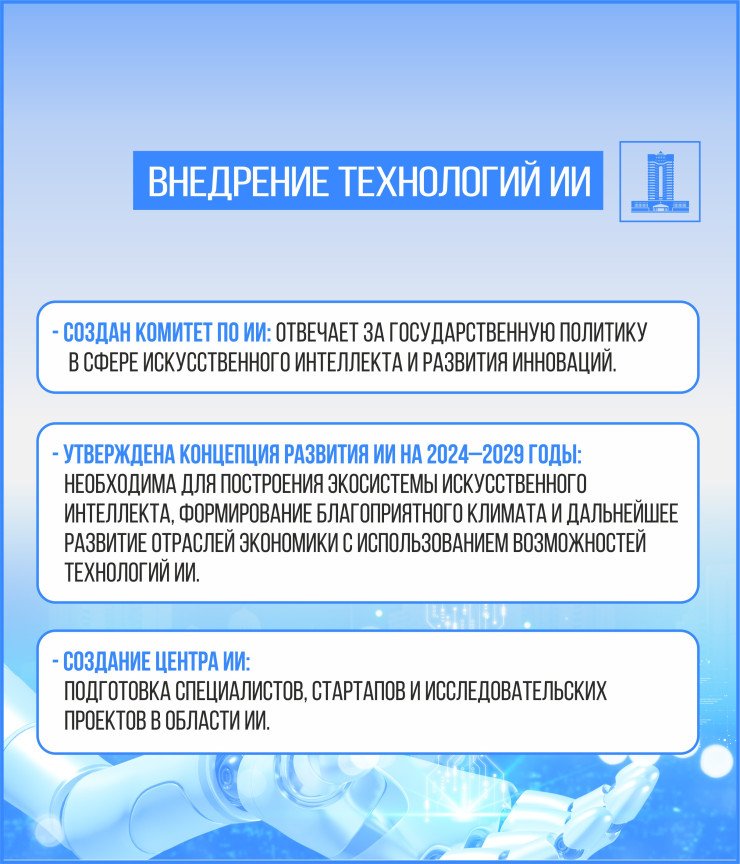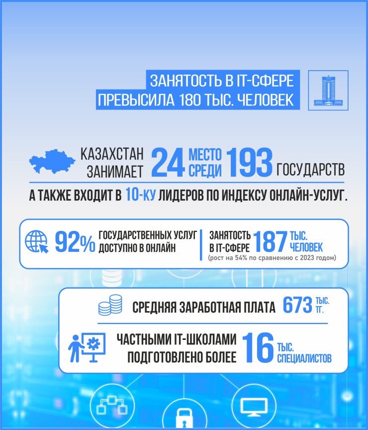 Цифровая трансформация продолжается с акцентом на внедрение технологий искусственного интеллекта и улучшение доступа к электронным услугам. Казахстан занял 24-е место по индексу онлайн-услуг, обеспечив 92% доступ к государственным услугам через интернет.