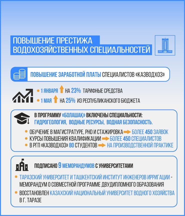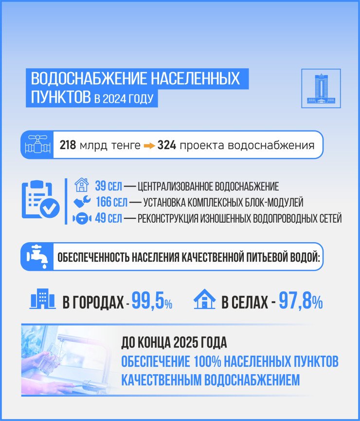 Казахстан предпринимает активные шаги в области управления водными ресурсами. Принятый новый Водный кодекс нацелен на рациональное использование водных ресурсов и включает меры по модернизации инфраструктуры. Обеспеченность населения качественной питьевой водой достигла 99,5% в городах и 97,8% в сельской местности.