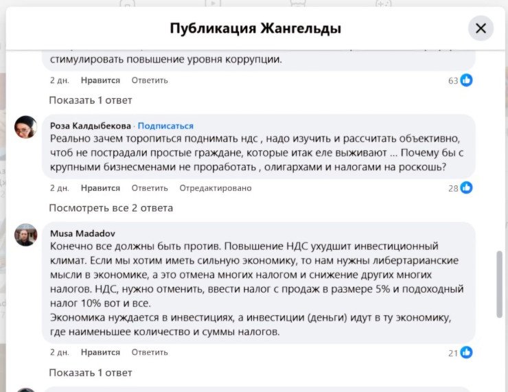 Заместитель премьер-министра Канат Бозумбаев сообщил, что вопрос повышения НДС обсуждается на уровне депутатов и правительства, и любые изменения должны быть согласованы с экспертами и бизнесом. Президент Казахстана Касым-Жомарт Токаев ранее подчеркивал, что простое увеличение налогов не является решением, и необходимо работать над улучшением налоговой системы и борьбой с теневой экономикой.