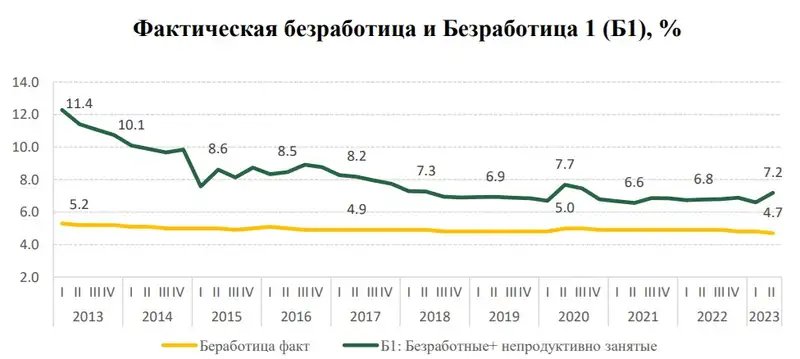 Уровень безработицы в Казахстане продолжает снижаться, что подтверждают данные Национального банка страны. За последние десять лет совокупная безработица, включая непродуктивно занятых и временно незанятых, сократилась почти вдвое — с 11,4% во втором квартале 2013 года до 7,2% к середине 2023 года. Несмотря на кратковременный рост безработицы во время пандемии, этот показатель быстро стабилизировался после снятия карантинных мер.