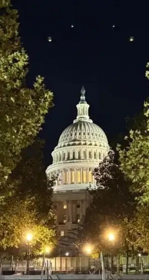 29 ноября в Вашингтоне произошло необычное явление, которое привлекло внимание пользователей социальных сетей. В это время в Конгрессе проходили слушания, касающиеся секретных программ, связанных с «инопланетными» космическими кораблями. На вирусном снимке, сделанном ветераном ВВС США Деннисом Диггинсом, запечатлены четыре ярких огня, расположенные над Статуей Свободы и куполом Капитолия.