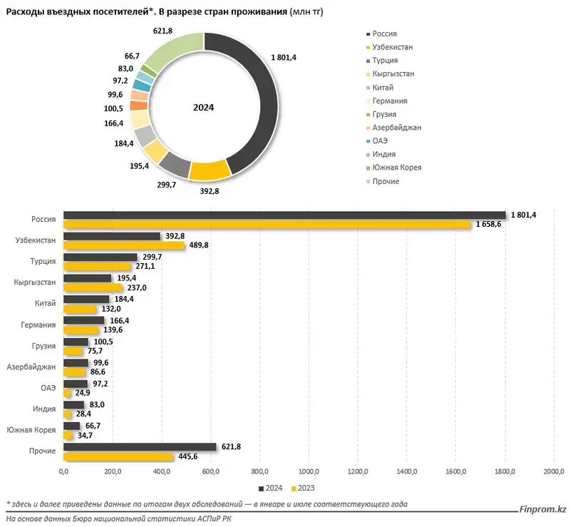В 2024 году Казахстан продолжает привлекать иностранных туристов, и россияне становятся основными вкладчиками в экономику туристического сектора страны. По данным аналитического портала Finprom.kz, расходы россиян в Казахстане увеличились на 8,6% по сравнению с прошлым годом, составив 43,8% от общего объема трат иностранных путешественников. Это составляет почти половину от всей суммы, оставленной туристами.
