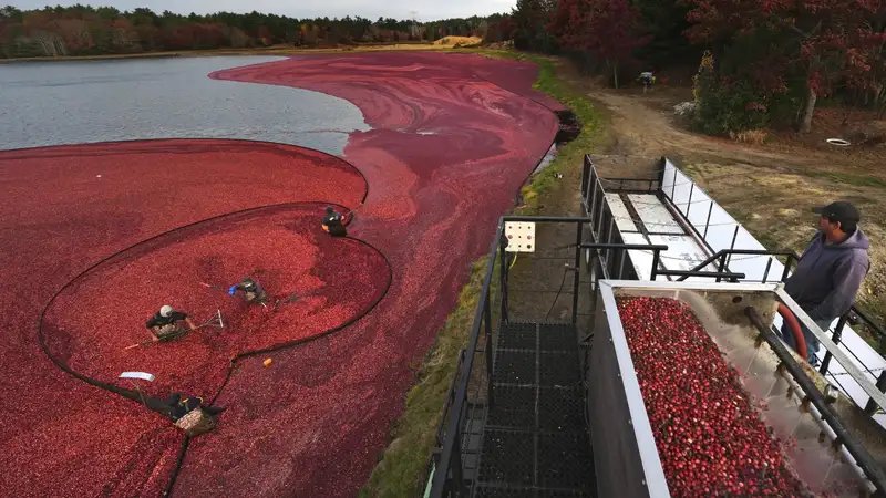 Клюквенные болота Массачусетса в этом сезоне привлекают внимание своим ярким розовато-малиновым цветом, который образуется во время сбора ягод. Рабочие, погруженные в воду по пояс, аккуратно собирают ягоды и направляют их к насосу, после чего они загружаются в грузовики. На перерабатывающем заводе клюква проходит этап очистки от листьев и превращается в соус, сок или сушеные ягоды.