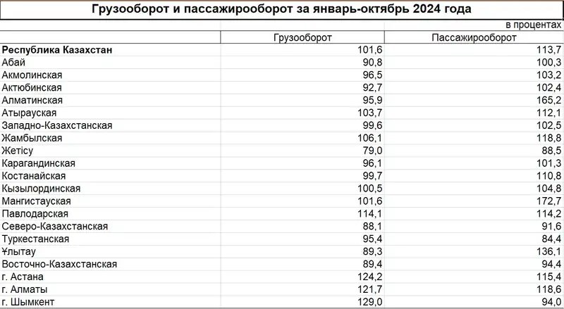 Среди пассажироперевозок выделяется Мангистауская область с ростом на 72,7%. Жамбылская область также показала хорошие результаты с увеличением на 18,8%. В Алматы пассажирооборот увеличился на 18,6%, в Астане — на 15,4%. Наименьший рост наблюдается в Акмолинской (3,2%) и Карагандинской областях (1,3%).