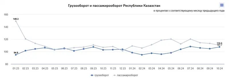 С января по ноябрь 2024 года в Казахстане было перевезено 883,4 миллиона тонн грузов, что на 8,9% больше по сравнению с аналогичным периодом прошлого года. Грузооборот достиг 422,6 миллиарда тонно-километров, увеличившись на 1,6%. Все виды транспорта продемонстрировали рост. Так, трубопроводный транспорт отправил 244,6 миллиона тонн грузов, увеличив объемы на 7,2%. Железные дороги перевезли 352,4 миллиона тонн, что на 2,2% больше, чем в 2023 году. Пассажироперевозки на поездах также выросли на 5,6%, составив 17,6 миллиона человек. Воздушный транспорт показал наибольший рост, перевезя 12,3 миллиона пассажиров — это на 11% больше, чем годом ранее. Автомобильный и городской электрический транспорт также продемонстрировали положительную динамику, увеличившись на 19,8%.