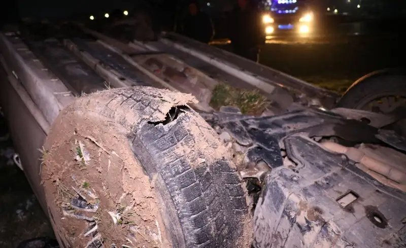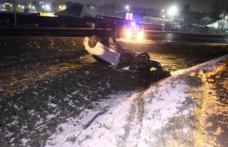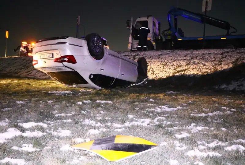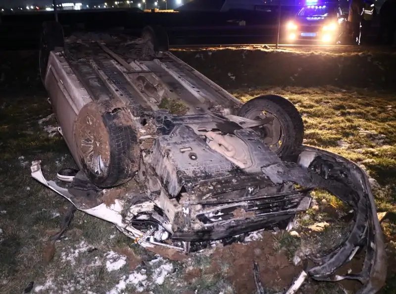 В результате аварии на трассе произошло серьезное ДТП, в котором автомобиль съехал с дороги и перевернулся. Водитель не справился с управлением, что привело к вырыванию колеса при столкновении с бордюром. Автомобиль также снес дорожный знак, после чего оказался в кювете и перевернулся, приняв вертикальное положение перед окончательным падением на крышу.